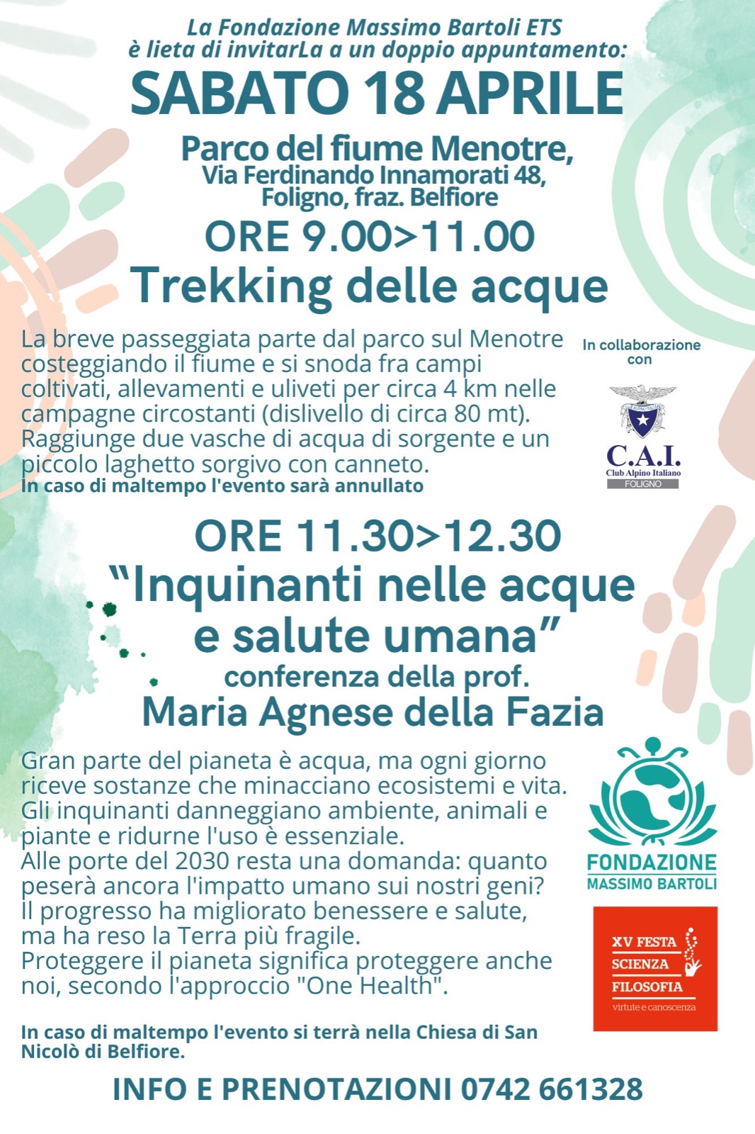 La nostra sezione collabora con la Fondazione Massimo Bartoli ETS e la XV edizione della Festa di Scienza e Filosofia al doppio evento che si terrà sabato 18 aprile a Belfiore dai titoli ‘Trekking delle acque’ e a seguire ‘Inquinanti nelle acque e salute umana’